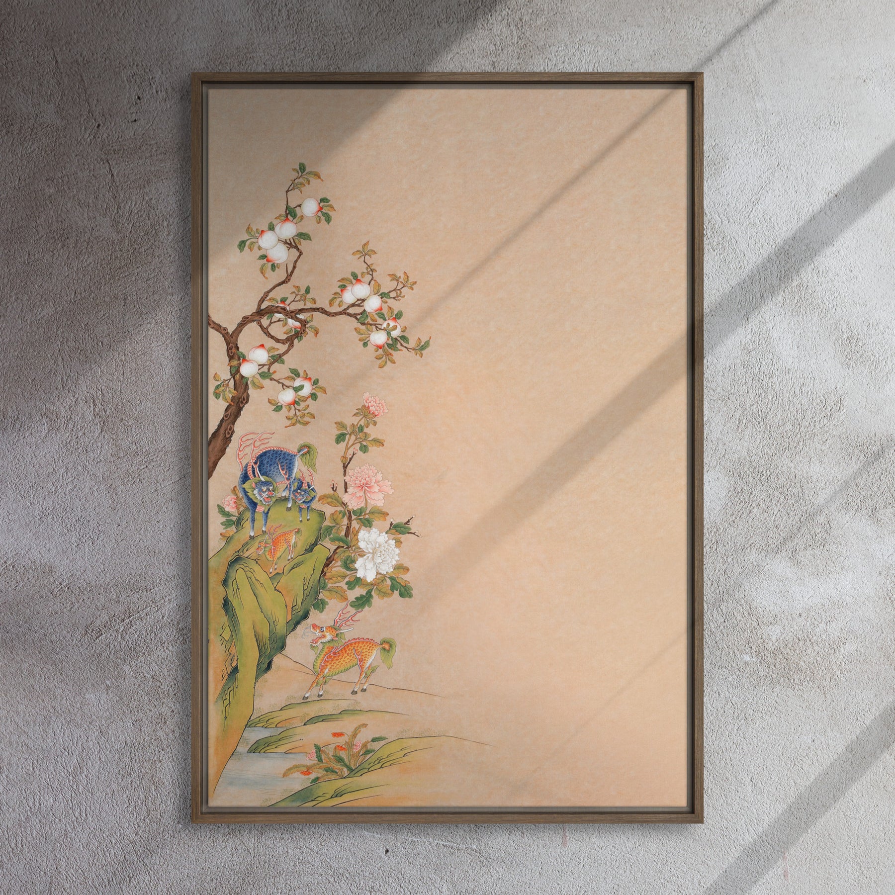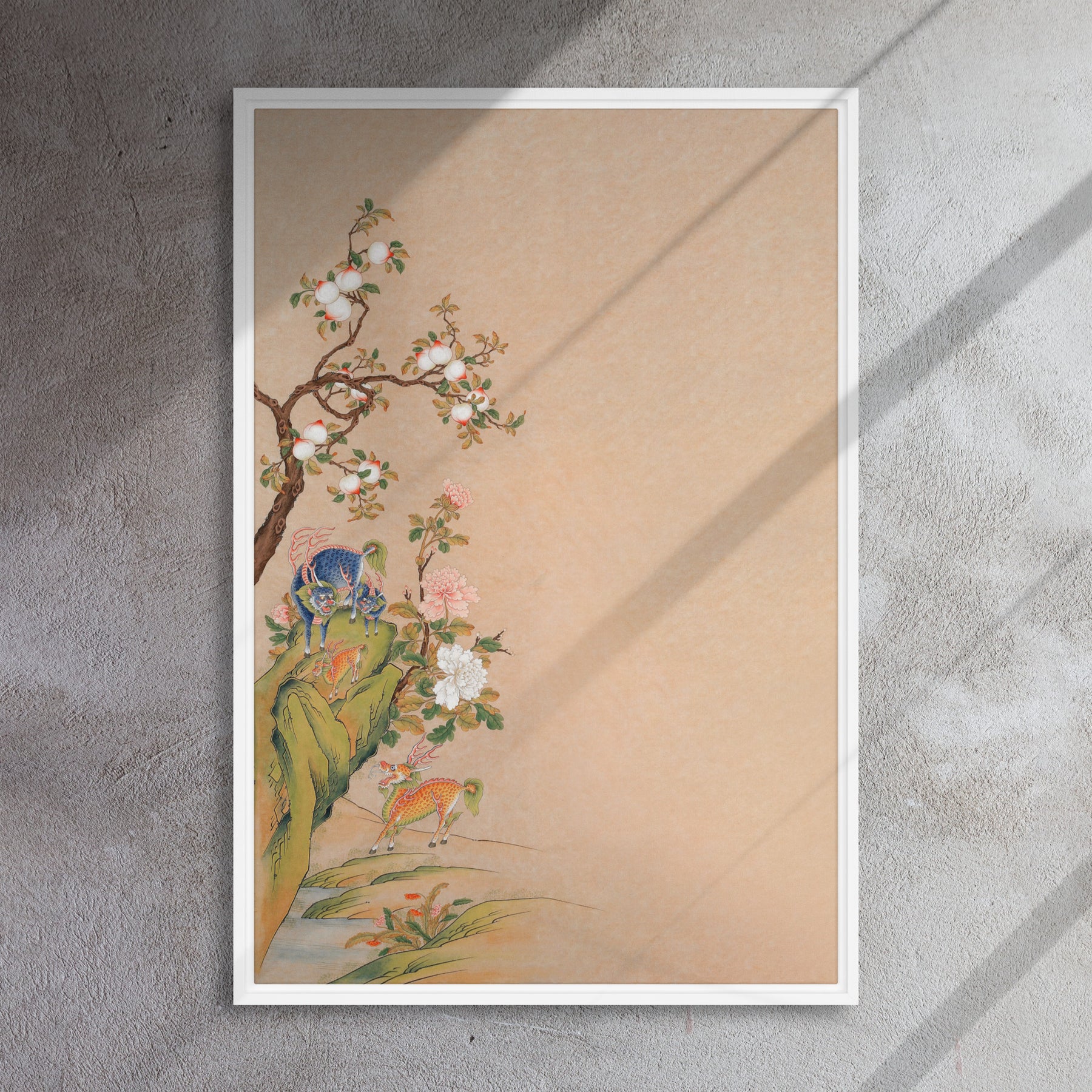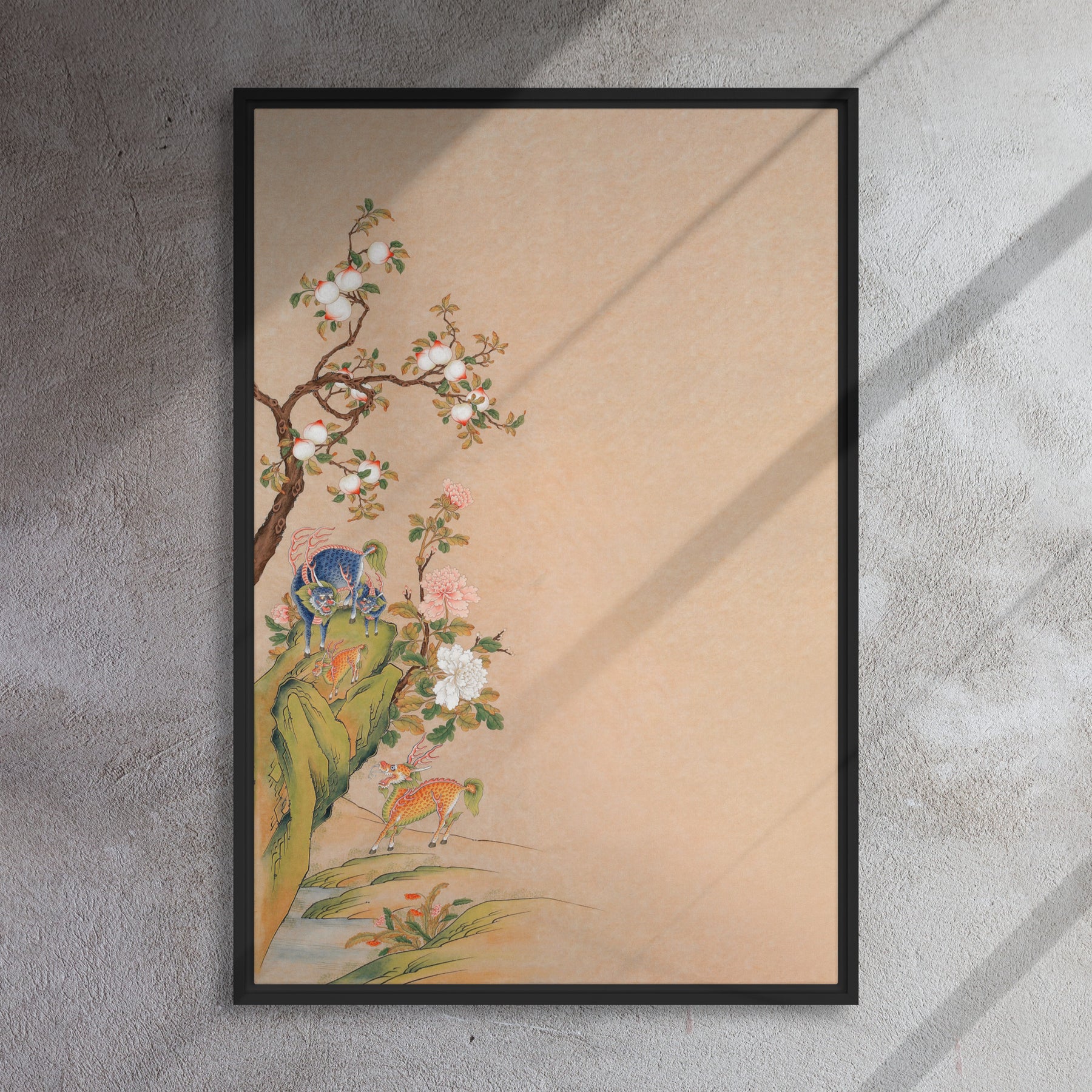 Peppe deine leeren Wände mit dieser Aufsehen erregenden gerahmten Leinwand auf! Diese hochwertige, gerahmte Leinwand - Phantastische Tierwesen des Gluecks und der Harmonie, links aus Kiefernholz wird mit Gummipuffern an den hinteren Ecken und einer Wandhalterung geliefert, die ein problemloses Aufhängen des Kunstwerks ermöglicht. Darüber hinaus verleiht der Rahmen der Leinwand einen coolen Schwebeeffekt!