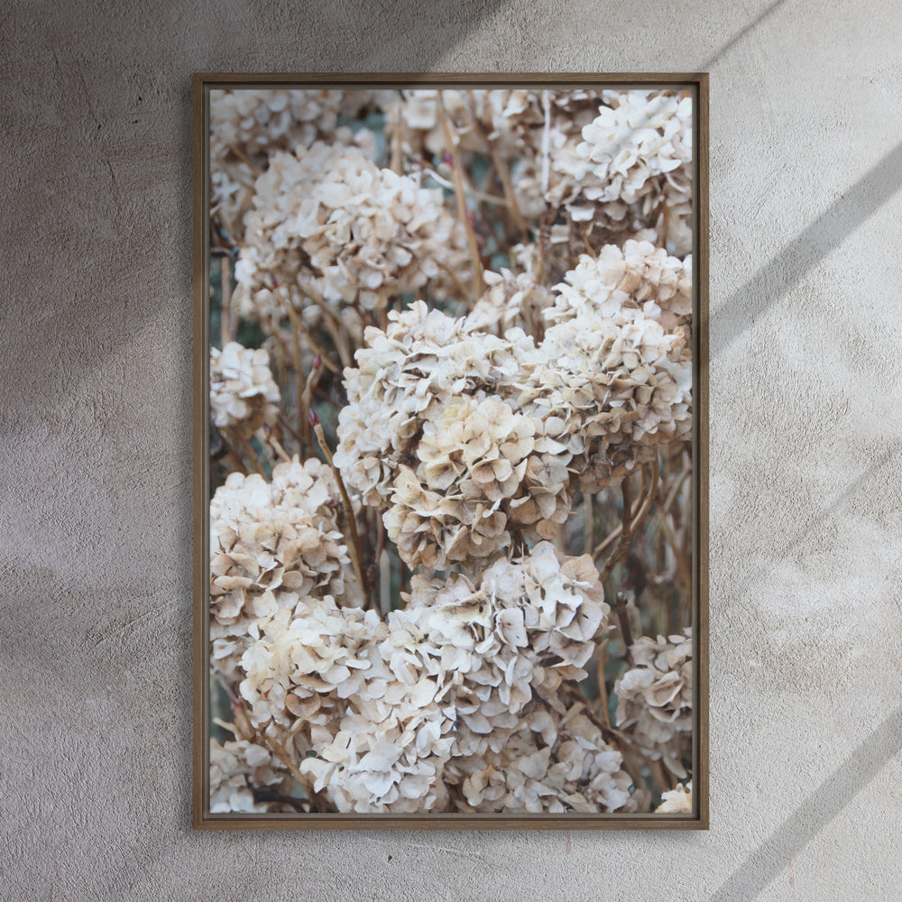¡Peppe tus paredes vacías con este llamativo lienzo enmarcado! Este lienzo enmarcado de alta calidad - Flores atemporales Hortensias en madera de pino viene con topes de goma en las esquinas traseras y un soporte para colgar en la pared que permite colgar la obra de arte sin problemas. Además, el marco del lienzo le da un efecto flotante genial.